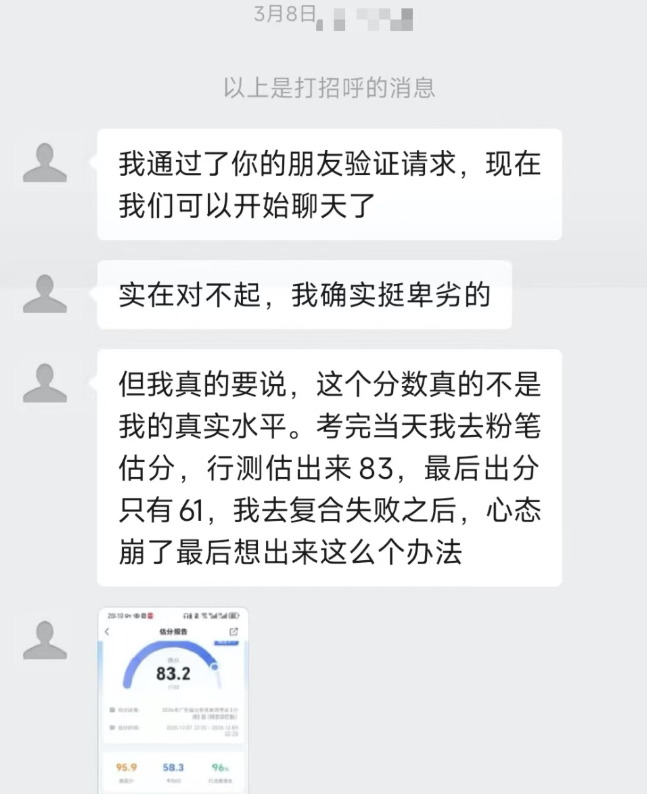 李明到广州参加口试时,结子了同岗笔试第三名陈磊(假名)。交谈中得知,陈磊此前也通过相易网帖与“第又名”有过交流,并添加了对方微信。