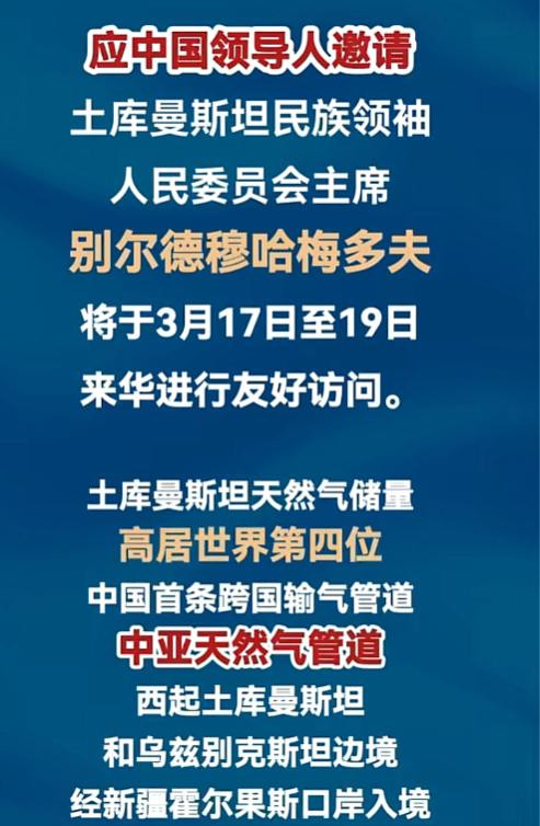 3月17日至19日应中方邀请,土库曼斯坦民族首领、东谈主民委员会主席别尔德穆哈梅多夫赴华伸开为期三天的肃肃造访。