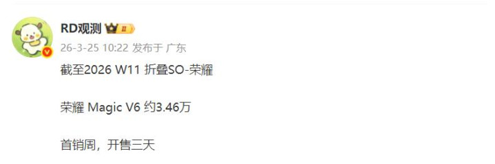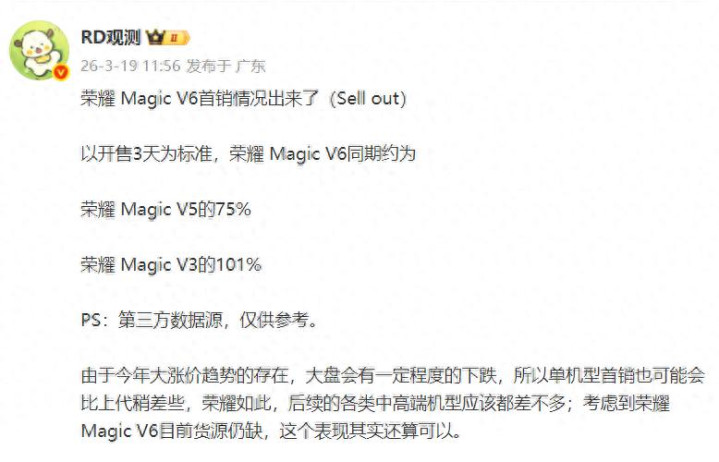 荣耀Magic V6首销三天达到了上一代荣耀Magic V5相似开售三天的75%,是上上一代荣耀Magic V3相似开售3天的101%。针对这个销量行业东谈主士以为本年情况相等非常 ,全体商场会有一定进度的下降,且荣耀Magic V6有好多版块皆在缺货中,是以这个发挥照旧可以的。