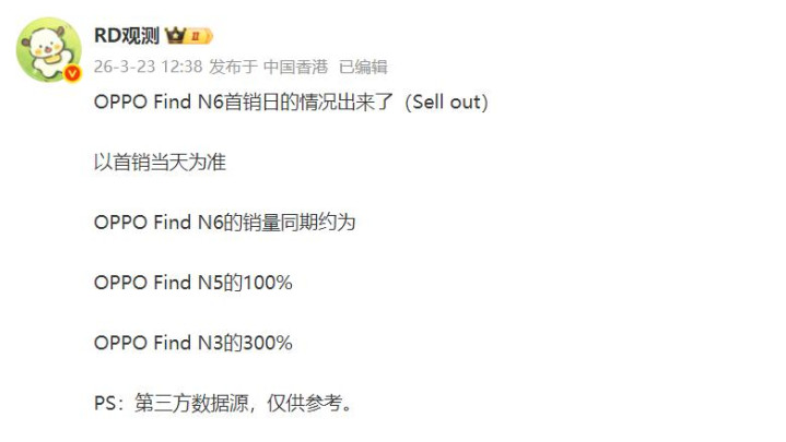 看完荣耀Magic V6的首销情况,赌钱娱乐咱们再来看OPPO Find N6的。证明行业东谈主士提供的数据OPPO Find N6首销本日约为上一代OPPO Find N5的100%,是上上一代OPPO Find N3的300%。也便是讲达到了上一代的水平,是上上一代的3倍。可以讲OPPO Find N6这个发挥格外可以了,要知谈这一代全体售价还高涨了1000块,起步价来到近万元。