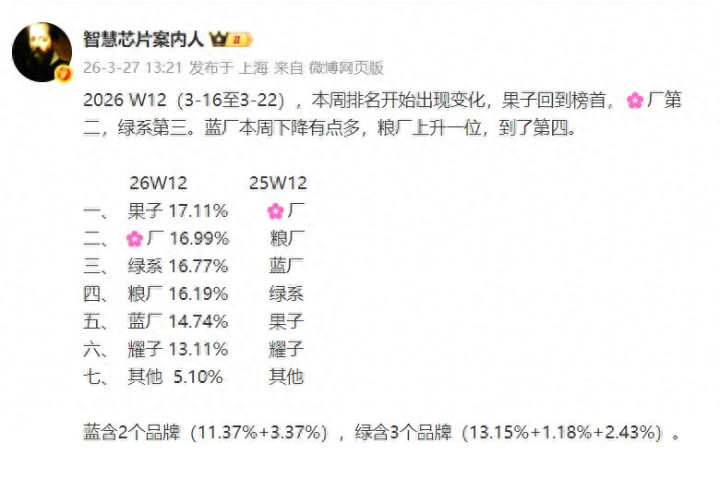 不信咱们看行业东说念主士“机灵芯片案内东说念主”提供的2026年W12周的国内排行,字据他提供的数据这一周排行如下: