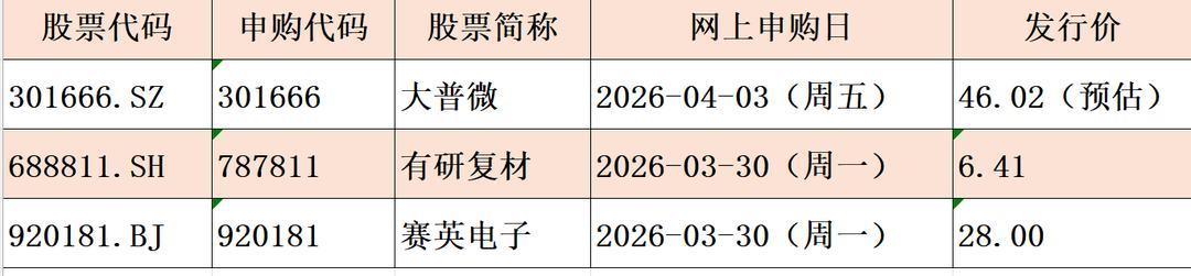 字据当今的刊行安排,下周(3月30日-4月3日)有3只新股申购,北交所、科创板、创业板新股各有1只。