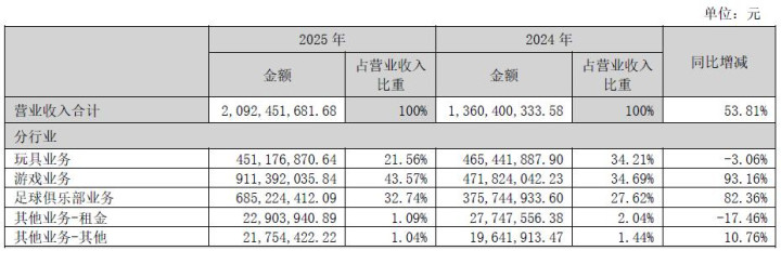 从业务板块来看,星辉文娱此前主业包括玩物、游戏和足球俱乐部三大板块。其中,公司2025年游戏业务营收9.11亿元,同步比高涨93.16%,营收占比达43.57%;足球俱乐部业务营收6.85亿元,同比增长83.36%,营收占比32.74%;玩物业务营收4.51亿元,同比微降3.06%,营收占比21.56%。
