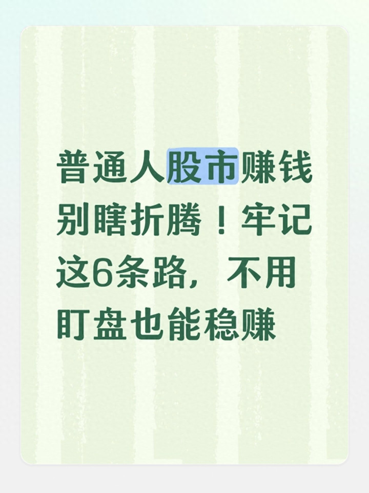 那些靠复杂筹算、内幕音问、追热门赢利的气象,从来王人不合适平凡东说念主。确切合适上班族、炒股小白的,王人是粗陋径直、不必费太多元气心灵的枢纽。今天就以多年商场不雅察和散户实操训戒,整理出平凡东说念主股市赢利6正阶梯,不必盯盘、不必选股、不搞玄学,走通其中一条,就能闪避大部分赔本,稳稳拿到收益。