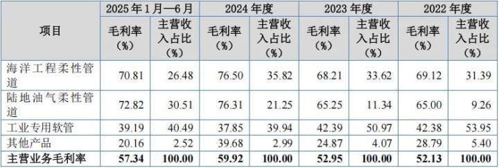 2022年至2025年6月,公司海洋工程柔性管说念销售收入分辨为5888.30万元、7235.99万元、9464.65万元和4019.65万元,2022-2024年度复合增长率达到26.78%,占主交易务收入的比重分辨为31.39%、33.62%、35.82%和26.48%;
