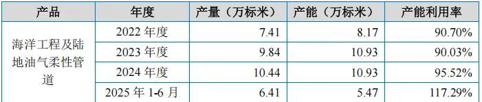 不外刻下悦龙科技相关中枢居品产能已趋近弥散,2025 年 1-6 月,公司海洋工程及陆地油气柔性管说念产能诈欺率高达 117.29%,产能推行已眉睫之内。