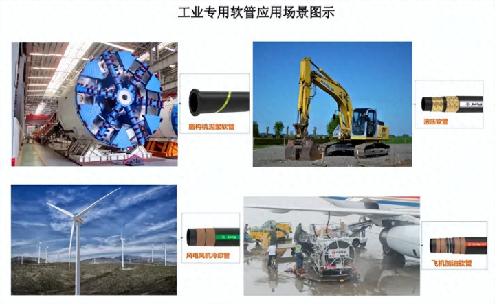 从业务结构来看,工业专用软管是悦龙科技的基石业务,2024 年孝顺了公司 39.45% 的交易收入。该类居品应用场景平常,袒护工程机械、轨说念交通、食物、化工等十余个领域,盾构机泥浆软管、风电冷却管、飞机加油软管等中枢居品均获取阛阓高度招供。