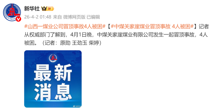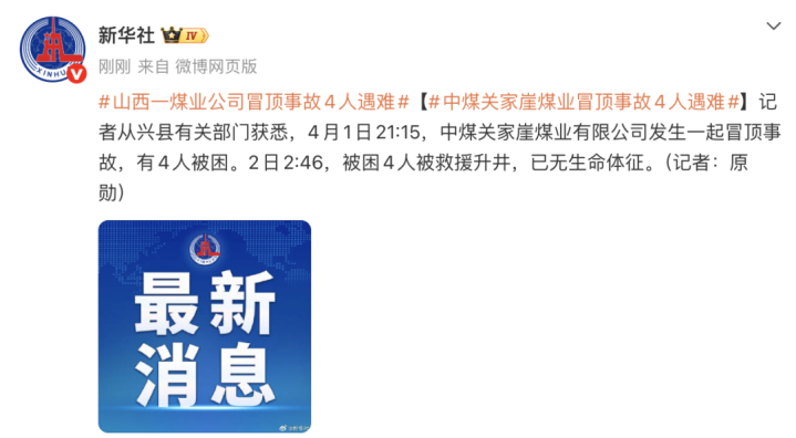 4月2日,据新华社,记者从兴县筹谋部门获悉,4月1日21:15,中煤关家崖煤业有限公司发生全部冒顶事故,有4东说念主被困。2日2:46,澳门在线(赌钱)娱乐网被困4东说念主被挽回升井,已无人命体征。