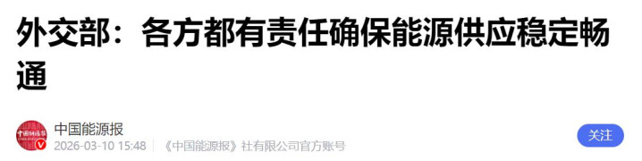 3月9日,应酬部发言东谈主郭嘉昆在恢复油价暴涨有关问题时,再次重申了这一态度:动力安全对世界经济至关苍劲,各方齐有包袱确保动力供应褂讪流畅。中方将汲取必要要领保险本人动力安全。