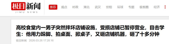 高校食堂内一男人倏地摔坏店铺设施,受损店铺已暂停生意,目睹学生:他使劲顿脚、拍桌面、掀桌子,又砸店铺机器,砸了十多分钟