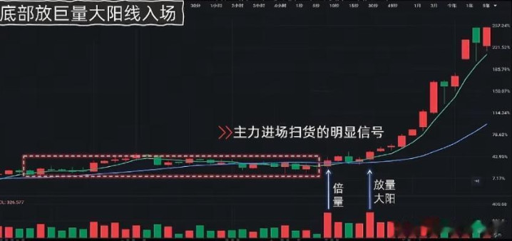 个股在低位永远横盘,筹码充分换手后,要是某一周成交量暴涨至前5周平均量的4倍以上,奉陪放量大阳线,就是主力进场扫货的明确信号。