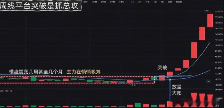 一朝某一周出现放量大阳线打破横盘平台,就是主力吸筹结束发起总攻的信号,后续主升浪行情一触即发。