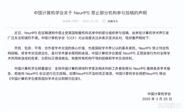 中国打算机学会第一时候发声,作风很明确,淌若神经信息措置系统大会不改正无理,就把神经信息措置系统大会踢出推选目次;同期命令中国科研东谈主员阻隔投稿、阻隔审稿、阻隔提供任何学术工作。