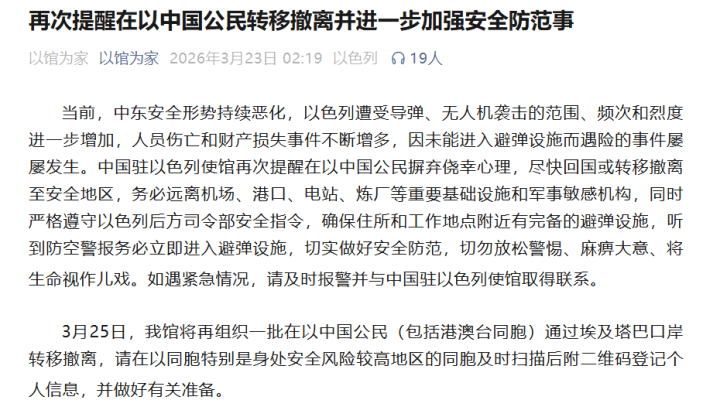 3月25日,我馆将再组织一批在以中国公民(包括港澳台本族)通过埃及塔巴港口转变猬缩,请在以本族绝顶是身处安全风险较高地区的本族实时扫描后附二维码登记个东谈主信息,并作念好关联准备。