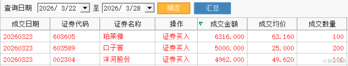 3月,还剩下周2个来去日。战事握住升级,好意思股呈破位走势,纳指仍是本事性熊市。咱大A,未来预料也少不了风暴。构兵确当下,资金更会向高股息、褂讪分成板块积聚。伊朗构兵之后,中国资产价值,会被再行发现,估值需要斥地。一、本周来去1.定投账户13月23日,合并天,三笔加仓,这个账户也满上了。珀莱雅,63.16元,加仓100股。至此,捏有600股,第二重仓,浮亏17%。洋河股份,49.62元,加仓100股。至此,捏有1000股,第一重仓,浮亏29.5%。口子窖,25元,加仓200股。至此,捏有700股,仓位排第七,浮亏19%。