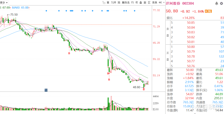 2.定投账户2洋河股份,3月23日,49.56元,加仓100股。至此,捏有800股,第一重仓,浮亏27.5%。总仓位提高到97%,接近满仓。剩余3%资金,恭候契机。3.儿子定投账户分众传媒,3月23日,6.47元,买入400股。至此,共计捏有1800股,浮亏5.5%。此账户也满上了。总结下来,除了定投账户2还剩3%仓位,其余三个都是满仓景色。前两个定投账户,分歧在月底和月初,又会进来些资金。天然未几,但每个月都有。再加上可能的股息,预测将来一两个月,又能储备些加仓的弹药。二、捏仓追踪1.珀莱雅周线六连阴,本周续创近六年新低。处于加快探底阶段,尚未出现明确止跌信号。话说回首,走势是走出来了,在走出来之前,一切都是概率,莫得富足。2.洋河股份访佛,更惨,周线践诺连跌八周。好在本周的下影线较长少量。最低探到48.6元,它会是本轮调理的最低点吗?我也不知说念,翘首企足。毕竟是第一重仓股,需要至极温雅。